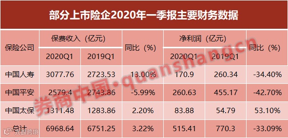 迄今,中国人寿、中国平安、中国太保三家上市险企公布了2020年一季报。数据显示,今年一季度,三家险企实现保费收入近7000亿元,同比增长3.22%,实现净利润515.41亿元,同比下降33.09%。