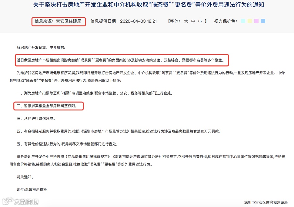 4月3日,深圳市宝安区住房和建设局发布《关于坚决打击房地产开发企业和中介机构收取“喝茶费”“更名费”等价外费用违法行为的通知》称,近日,宝安区房地产市场相继出现购房缴纳“喝茶费”“更名费”的负面舆论,涉及新锦安海纳公馆、云玺锦庭、润恒都市名荟等多个楼盘。