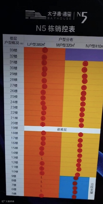 该楼盘推出的是N5栋公寓,9-13万元/㎡,户型320-410㎡,单套总价2900-5500万元,共计54套。根据销控表,开盘一小时,便售出32套,吸金超过14亿元。