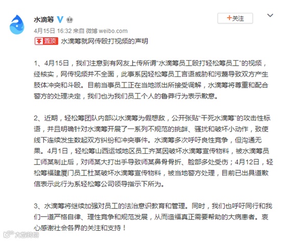 随后,水滴筹发声明称,网传视频并不全面,此事因轻松筹员工言语威胁和污蔑导致双方产生肢体冲突和斗殴,双方正在当地派出所接受调解,水滴筹为员工个人鲁莽行为道歉。