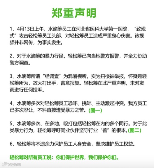 轻松筹在声明中表示,水滴筹多次对轻松筹员工恐吓、挑衅并主动激起冲突,轻松筹员工已多次忍让。