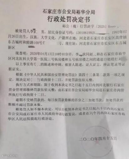 公安介入调查后,结果已经出来,对打人者出具行政处罚决定书,打人员工被拘留12日,并处以500元罚款。