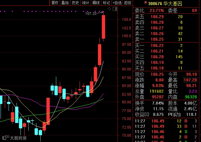 机构预测华大基因(300676)新冠病毒检测试剂月赚12亿元的消息,让4月16日华大基因走势逆市亢奋,早盘高开后随即涨停,股价重回百元报107.2元,市值428.91亿。