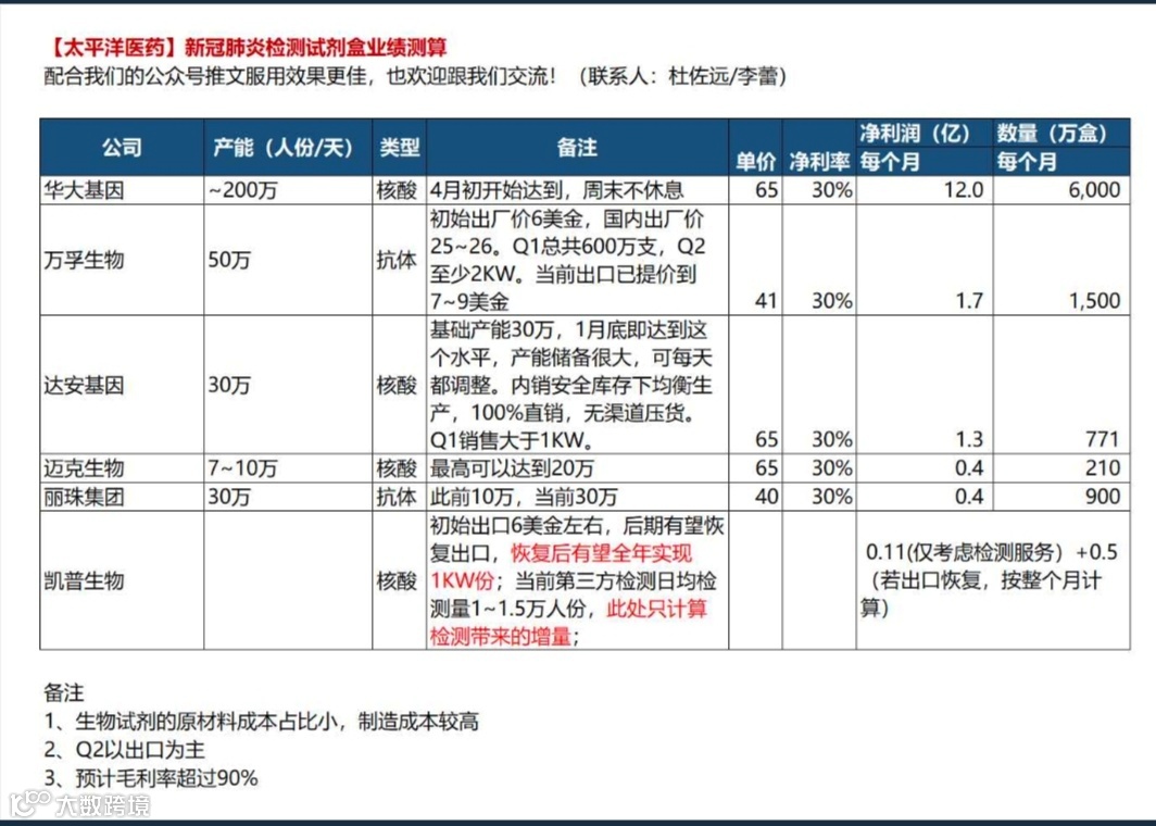 太平洋证券预计,实际检测需求量极大且检测时间将会拉的比此前想象的更长,至少将会持续到6月底。检测试剂公司一季度业绩尚未完全反应新冠检测试剂带来的业绩弹性。鉴于海外疫情进展节奏不同于国内,尚有印度、南美和非洲等非发达地区检测率很低,相信国产试剂盒在这些地区有广阔的应用空间。