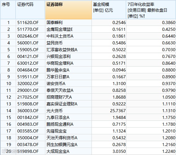 下图为全市场货币市场型基金中7日年化收益率最低的20只产品,7日年化收益率均低于1.5%,最低的仅有0.386%。在这20只产品中,有7只货基的基金规模均低于5000万元,而市场平均值为51.2亿元。