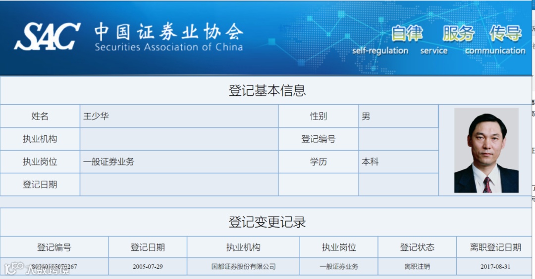 记者从证券业协会官网查询,2017年8月31日,王少华从国都证券登记离职。