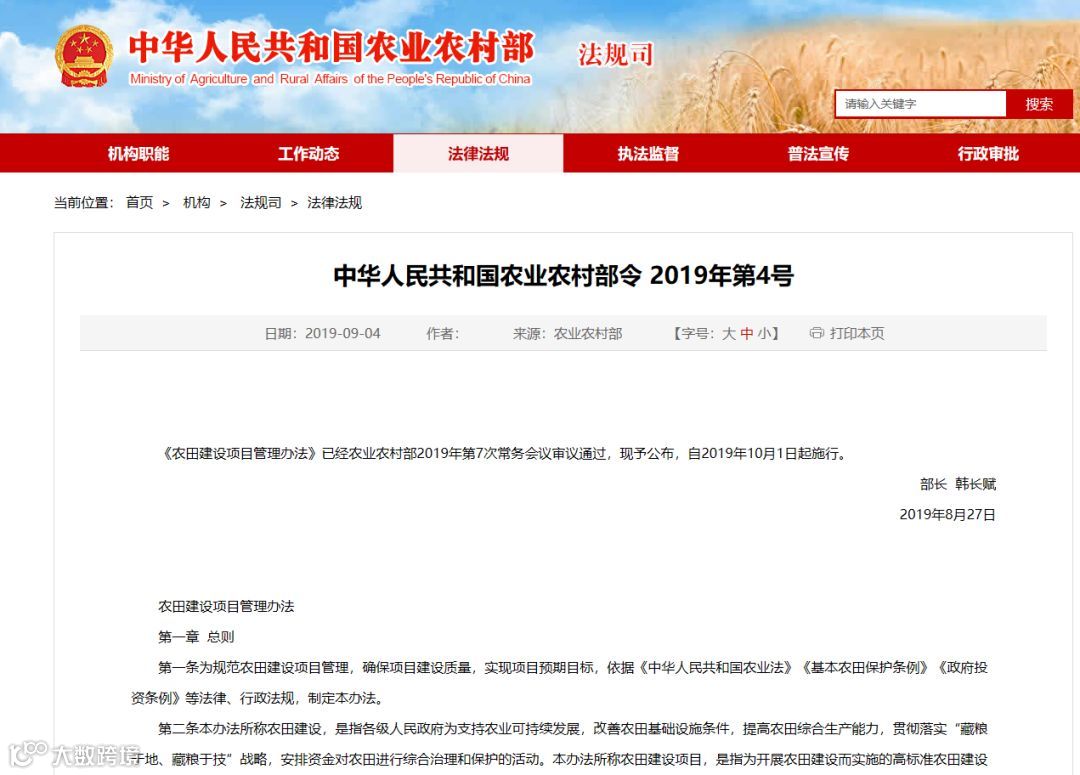 《农田建设项目管理办法》已经农业农村部2019年第7次常务会议审议通过,现予公布,自2019年10月1日起施行。