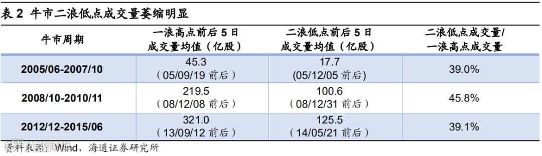 等市场情绪指标降到低点后物极必反。经济数据是宏观基本面的度量指标,市场情绪则是股市最直接的反应,以周期轮回来理解以成交量为代表的市场情绪,借鉴历史上三轮牛市经验,当2浪末期全部A股成交量萎缩至1浪高点的40%左右时,市场情绪悲观到极致,此后往往峰回路转,市场进入新一轮上升期,迎来牛市3浪阶段。同样以05-07年牛市为例说明,在05/09/19前后1浪高点成交量均值为45.3亿股,而在05/12/05前后2浪低点降至17.7亿股,2浪低点成交量萎缩至1浪高点的39%。而08-10年牛市2浪低点成交量萎缩至1浪高点的46%;12-15年牛市中,以上证综指刻画,牛市2浪低点成交量萎缩至1浪高点的39%。2019年来的这轮牛市,牛市1浪高点前后的成交量均值为1098亿股左右,今年2/25-3/2日均成交量1026亿股为阶段性高点,与1浪高点接近,最近5日均成交量均值为570亿股,仅为前期高点的52%,当前成交量萎缩程度还不够。反观19年8月初和12月初的低点(如果没有疫情爆发,那时就是牛市2浪调整的末期),当时成交量萎缩比较充分。19年8月初上证综指低点前后成交量为391亿股,仅为牛市1浪高点的 35.6%,12月初上证综指低点前后成交量为325亿股,仅为牛市1浪高点的 29.6%。