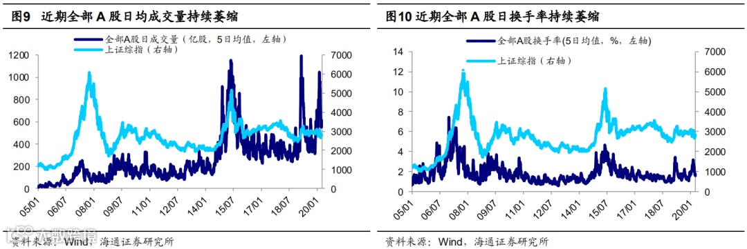 从换手率看,最近5日全部A股换手率为1.1%左右,而2018/10/19上证综指低点前后为0.6%左右,2019/01/04上证综指低点前后为0.5-0.6%,2019/08/06上证综指低点前后为0.6%左右,2019/12/03上证综指低点前后为0.6%左右,目前换手率未达到过去两年阶段性低点时期的水平。