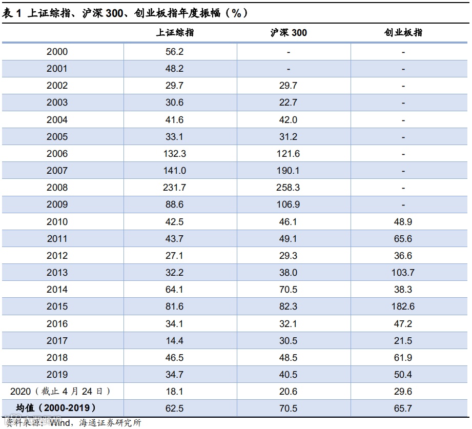 以年度视角看,市场振幅最终有望向上拓宽。统计A股主要股票指数2000年至2019年的年均振幅,其中上证综指2000年以来年振幅大部分时间在25%-45%之间,只有在大牛市或熊市的时候振幅会上升到80%以上,年平均振幅为62.5%,2017年振幅最小,仅14.4%,但这一年市场结构性特征明显,上证50为代表的价值股全年涨幅25.1%,而创业板指为代表的成长股全年下跌-10.7%。而今年(截至4/24)上证综指振幅只有18.1%,还不及近过去20年年均振幅的1/3。沪深300指数2002年设立以来年振幅大部分时间在30%-50%之间,平均振幅为70.5%,2003年振幅最小22.7%,而今年振幅20.6%;创业板指2010年设立以来年振幅大部分时间在35%-65%之间,平均振幅为65.7%,今年振幅29.6%。