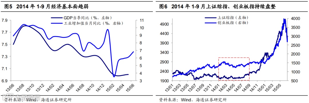 从市场风格看,2013年开始股市结构性特征明显,创业板指为代表的成长股持续上行,一直到 2014年2月涨幅达106.3%,随后14年2月-6月下跌盘整,最大跌幅20.4%。这一时期上证综指在1974-2177点窄幅盘整,市场整体萎靡且无结构性机会。当下也是类似,2019年以来创业板指为代表的成长股再次占优,一直到 2020年2月涨幅达82.9%,但3月以来近期创业板也相对低迷,在1800-2000点持续震荡。