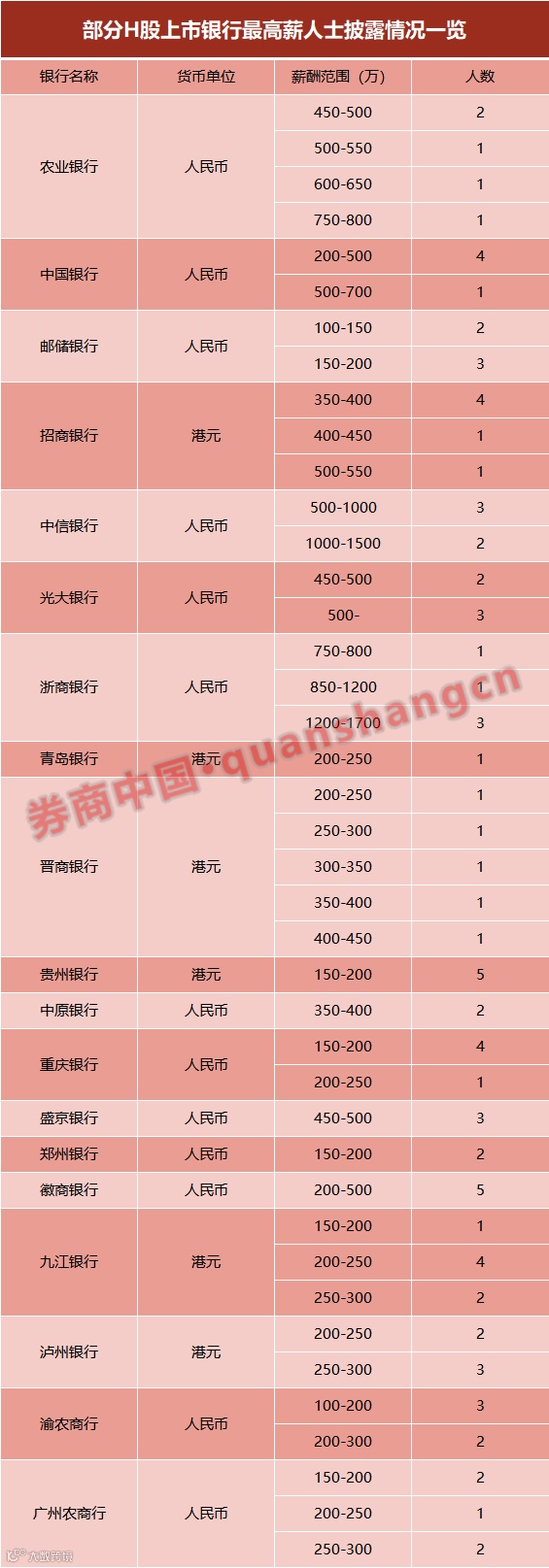 截至目前,已有19家H股上市银行在港股年度业绩中披露高薪员工情况。其中,13家银行的五位薪酬最高人士中,完全没有董事或监事。