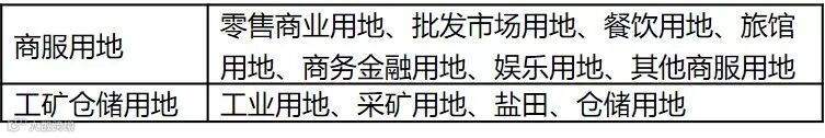 目前土地规划、审批、登记等工作适用的《土地利用现状分类》(GB/T 21010-2017)中与“工业”、“商业”近似度较高的是“商服用地”、“工矿仓储用地”,对应的具体用途如下: