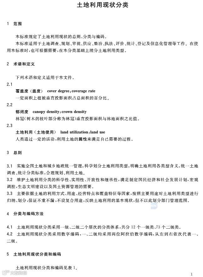 《土地利用现状分类》国家标准采用一级、二级两个层次的分类体系,共分12个一级类、57个二级类。其中一级类包括:耕地、园地、林地、草地、商服用地、工矿仓储用地、住宅用地、公共管理与公共服务用地、特殊用地、交通运输用地、水域及水利设施用地、其他土地。