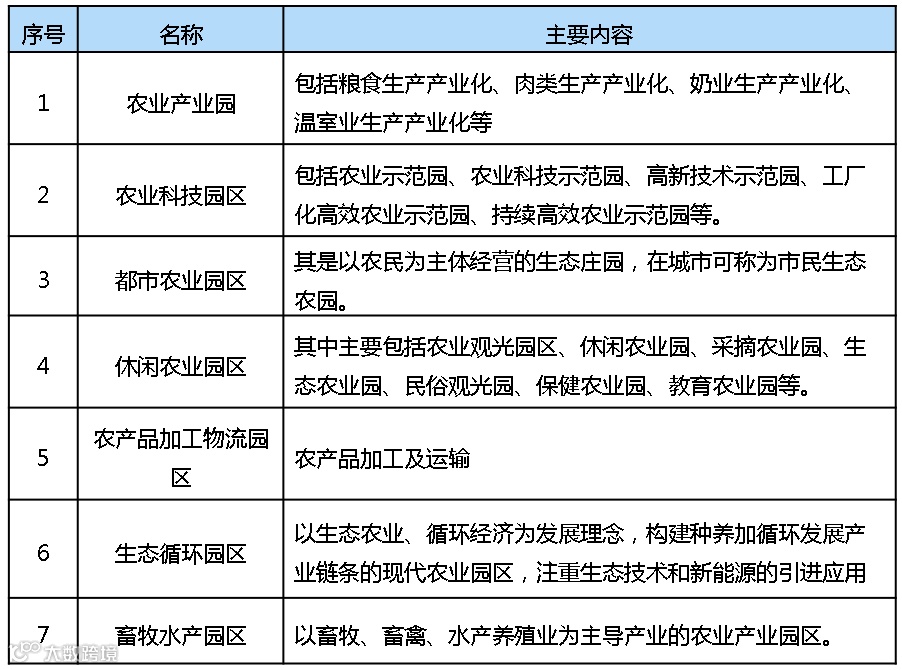 主要包括农业产业园区、农业科技园区、都市农业园区、休闲农业园区、农产品加工物流园区、生态循环园区及畜牧水产园区七大基本类型。