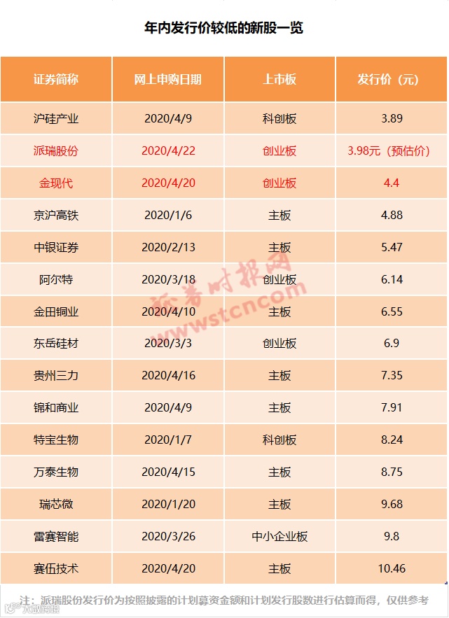 值得注意的是,上述待申购新股中,派瑞股份如果按照披露的计划募资金额和计划发行股数进行估算,发行价为3.98元,这将成为年内发行价第二低的新股,也是年内发行价最低的非科创板新股。金现代的发行价也较低,为4.4元。