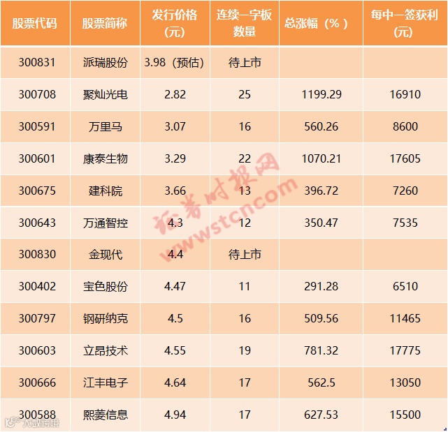 此次发行价最低的两只新股金现代和派瑞股份均为创业板股票,它们的发行价都可进入创业板最低的10大股票之列。历史数据显示,此前创业板发行价最低的10只股票上市后,连板数量最低为11个,最高达25个,平均连板数量亦高达16.8个。