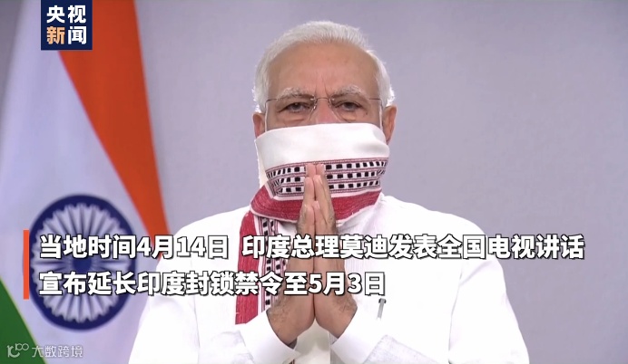 当地时间14日,印度总理莫迪宣布延长全国封锁令至5月3日。莫迪此次讲话期间选择使用当地一种传统围巾作为面部防护,待正式演讲时才取下。莫迪在上周举行的视频会议中也曾戴过“自制口罩”。