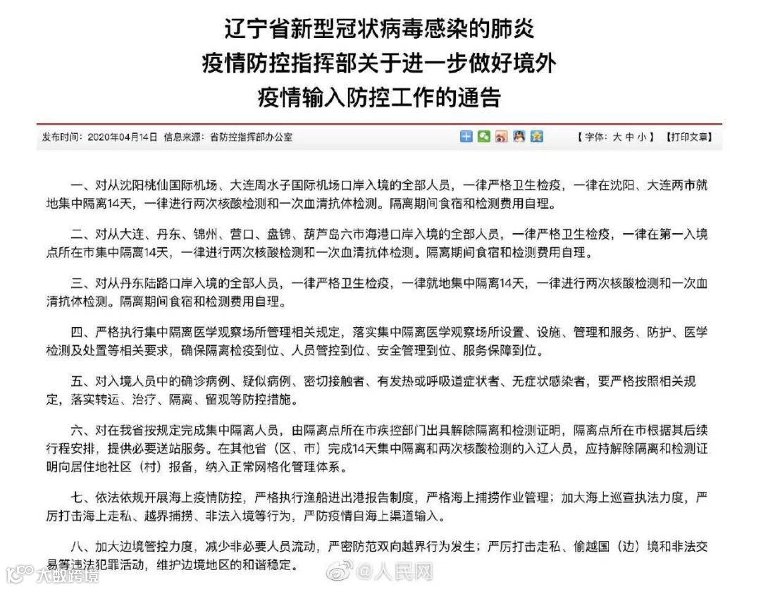 4月14日,辽宁新型冠状病毒感染的肺炎疫情防控指挥部发布关于进一步做好境外疫情输入防控工作的通告。《通告》指出,对从沈阳、大连、丹东等地入境的全部人员,一律集中隔离14天,一律进行两次核酸检测和一次血清抗体检测。隔离期间食宿和检测费用自理。