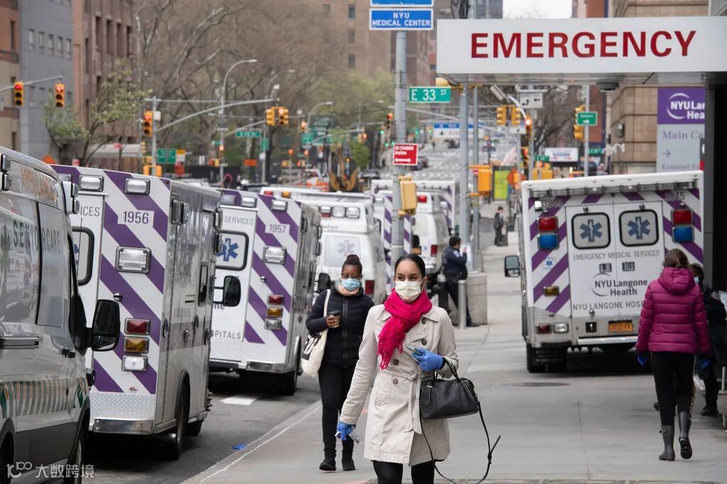 △救护车在纽约贝尔维尤医院外排队等候 | 联合国图片