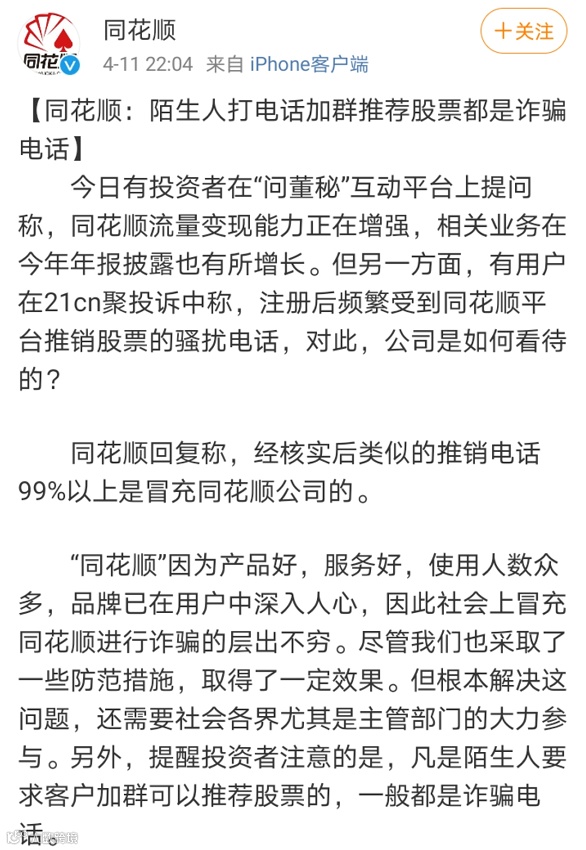 对于此次风波,同花顺也给出了自己的解释:部分投资者安全防范意识不够导致资金账户、密码泄露。其认为,部分投资者因为在炒股微信群里被骗或其他各种原因泄露了证券公司的交易账号和密码,导致盗买盗卖的发生。