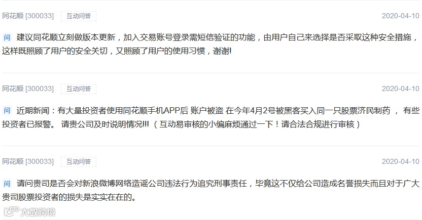 近日,有一些股民反映证券账户被盗用,不仅卖出原有持仓股票,更大量买入次日一字跌停的济民制药。开户券商虽然不同,但使用同花顺软件是投资者的共同点之一,因此投资者们也将矛头对准了同花顺。此后,同花顺也对此作出声明,称“网络传言与事实不符”, 呼吁用户加强账户安全防范意识。