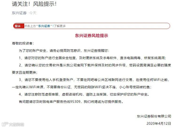 例如,4月12日下午,东兴证券官方微信号即发布风险提示,提醒投资者注意账户安全。