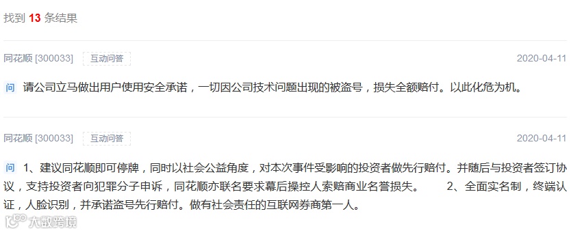 在应对方面,同花顺表示,其建立了安全完善的服务器系统和数据存储保障制度,设立了灾难备份中心,以确保系统和数据的稳定和安全。不过,同花顺也坦言,“在当前网络环境下,任何一个IT系统都可能面临安全问题”。