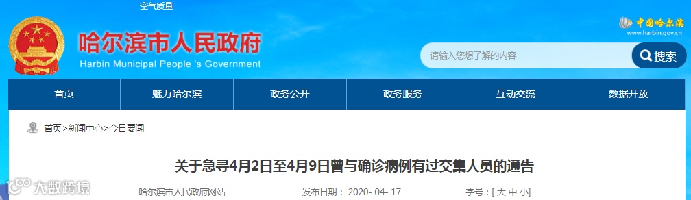 17日晚,哈尔滨市人民政府网站发布“关于急寻4月2日至4月9日曾与确诊病例有过交集人员的通告”。