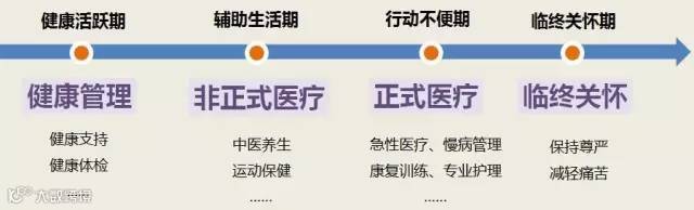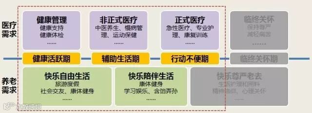 ②医的需求:针对自理型老人的健康管理、慢病管理、康复运动,到针对刚需老人的专业护理,以及急救;