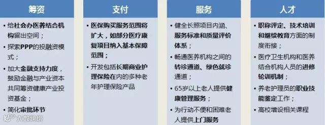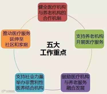 2015年11月,国务院办公厅转发国家卫计委、民政部、发改委、财政部、人社部、住建部等九部委《关于推进医疗卫生与养老服务相结合的指导意见》,明确了五大重点工作方向: