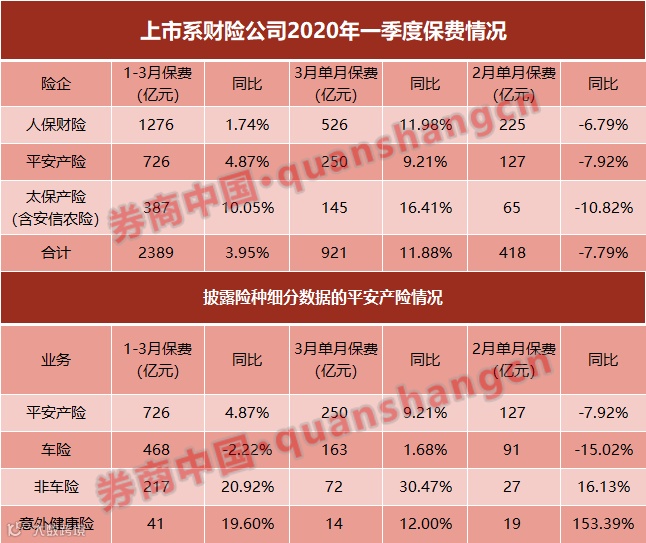 另外两家财险也在3月份单月实现同比高增长。其中,平安产险3月单月保费收入250亿,增长9.2%;太保产险3月单月保费收入145亿,增长16.4%。