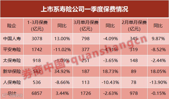 5家A股上市系寿险公司方面,一季度合计保费6857亿,同比增长3.44%,增速低于前2月。从不同险企看,一季度业务仍然是“涨跌互现”。