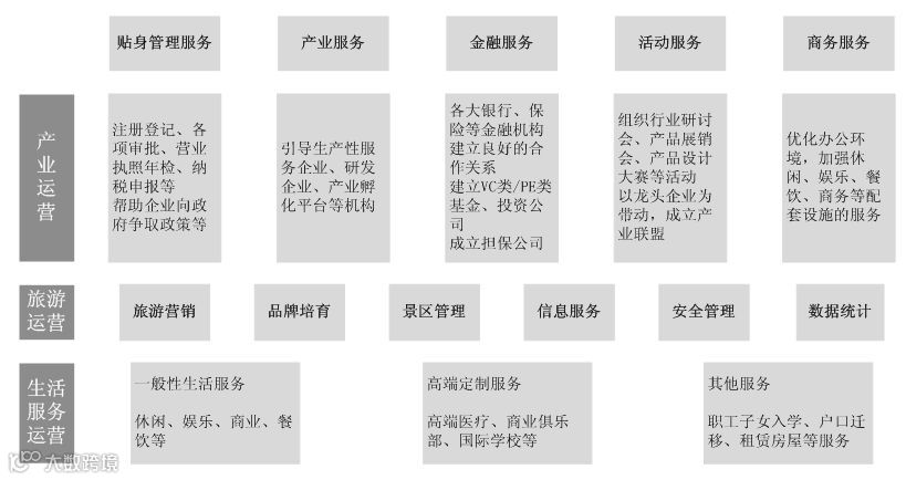 一是为小镇居民提供休闲、娱乐、商业、餐饮等一般性生活服务,并根据常住人口的特征,提供高端医疗、俱乐部等定制服务;