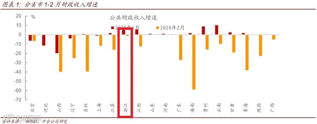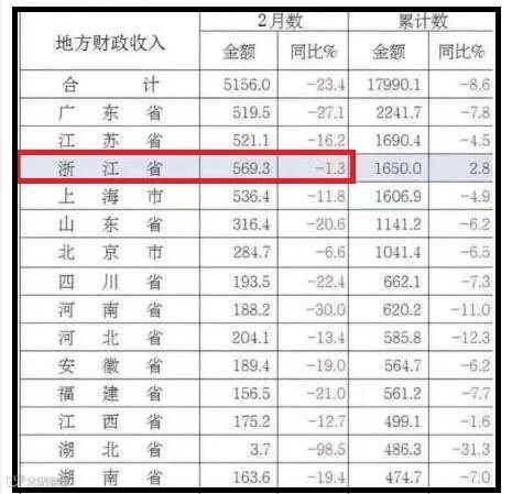 而浙江公布的2月份一般公共财政收入,是惊人的-1.28%,几乎没降!