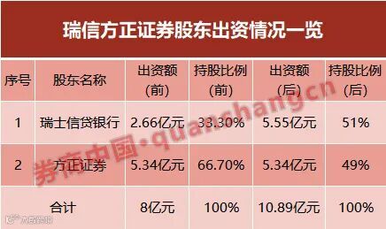 在斥资6.28亿元后,瑞士信贷银行正式成为瑞信方正的主要股东、控股股东,持股比例自33.3%提高到51%,瑞信集团成为瑞信方正证券的实际控制人。瑞信方正的注册资本也将从8亿元提升至10.89亿元,正式迈入外资控股的券商小团体。