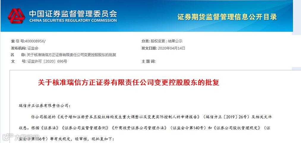 4月17日,证监会官网挂出《关于核准瑞信方正证券有限责任公司变更控股股东的批复》,正式做出同意批复。