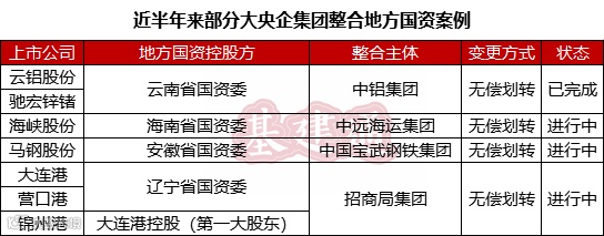 近日,有数据统计,从2018年底至今半年时间内,云铝股份、驰宏锌锗、海峡股份、马钢股份等A股公司的实际控制人已经或正在筹划从地方国资委变更为国务院国资委。同时,辽宁省港口整合也快速推进,涉及到锦州港、大连港、营口港等多家上市公司,由招商局集团主导运营,开展央企与地方的深度合作。除了前述地方国企之外,包括海南海药、同方股份、恒通科技、环能科技、*ST尤夫等A股上市公司也正在筹划或已经完成实际控制人从其他部委或自然人到国务院国资委的变更。