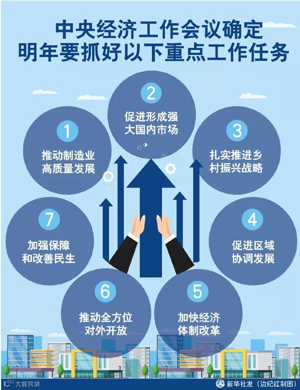 会议指出,明年是新中国成立70周年,是全面建成小康社会关键之年,做好经济工作至关重要。会议确定,明年要抓好以下重点工作任务: