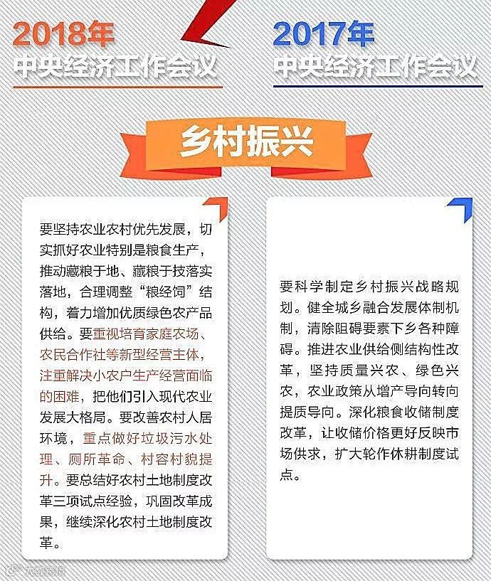 对比发现,今年经济工作会议的乡村振兴部分主要提到四个方面,一是切实抓好农业特别是粮食生产,推动藏粮于地、藏粮于技落实落地,合理调整“粮经饲”结构,着力增加优质绿色农产品供给;二是重视新型经营主体发展;三是改善农村人居生活环境;四是继续深化农村土地制度改革。