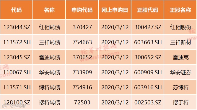 3月12日周四,红相转债、三祥转债、雷迪转债、华安转债、博特转债、搜特转债等6只可转债同日集中申购。