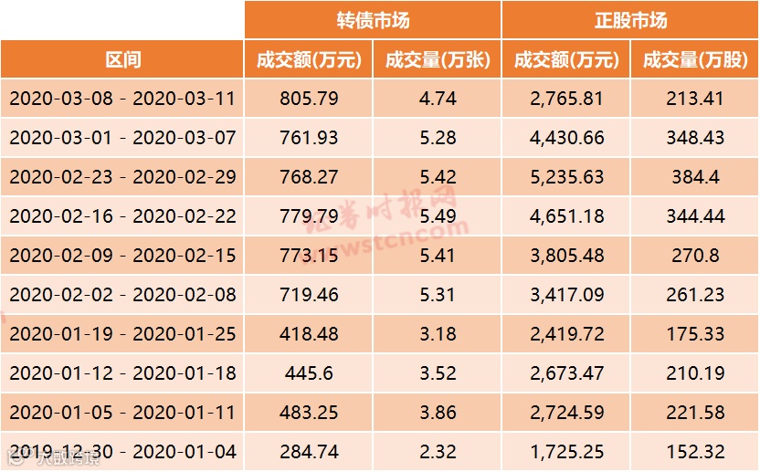 Wind统计数据显示,去年年末,转债市场成交额仍在300亿元水平波动,到了今年3月首周,转债市场成交额已经大幅攀升至761.93亿元,成交量也高达5.28亿张。本周以来(3月9日至11日),仅仅3个交易日,转债市场成交额就已经突破800亿元大关,达805.79亿元,刷新历史新高,若保持这种势头,全周成交额有望超过1300亿元。
