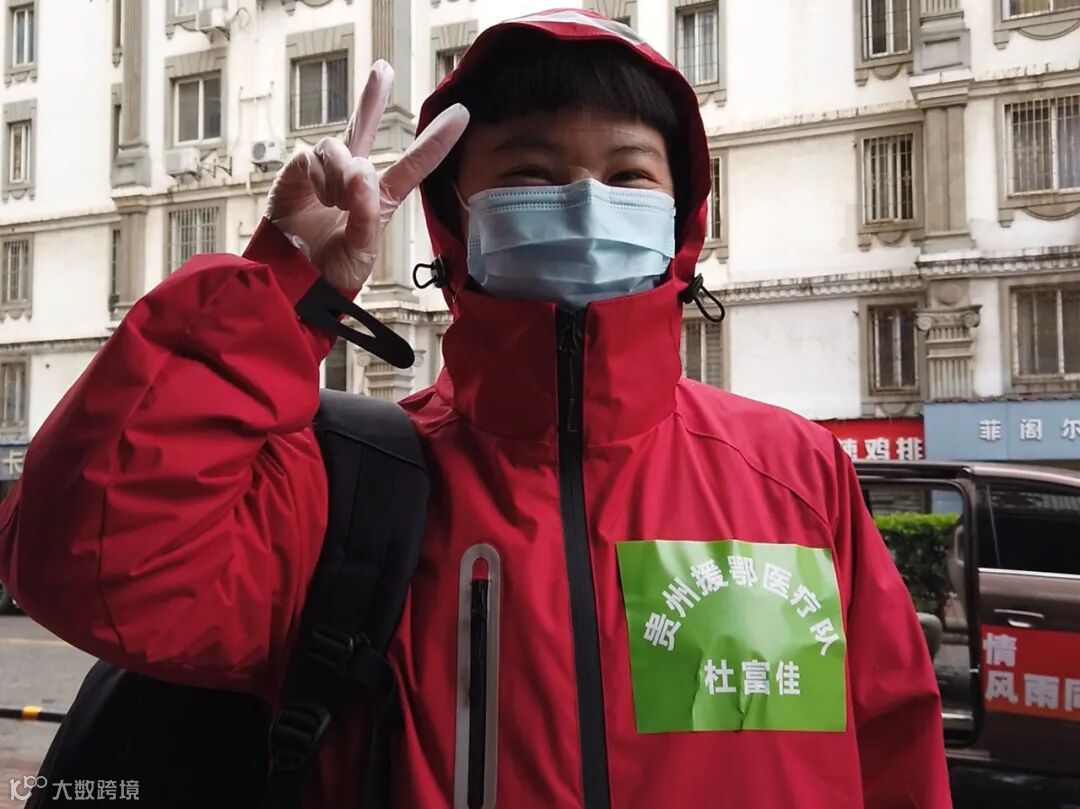 “杜富佳,贵州援鄂医疗队”,绿底白字,贴在胸口,她笑了。