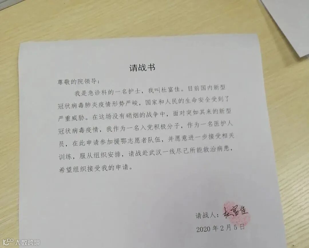 杜富佳:医院发了倡议书,我就报名了。过年的时候我看到部队派人去支援武汉,那时候我在想,我要是能去就好了。