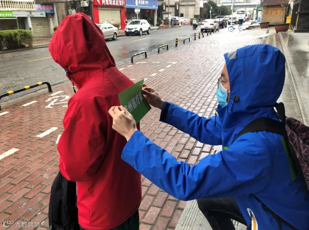 一起等车的同伴郭磊冲锋衣上贴着“贵州医疗队”的队标和姓名,杜富佳也从包里掏出她那份不干胶,请郭磊帮忙。