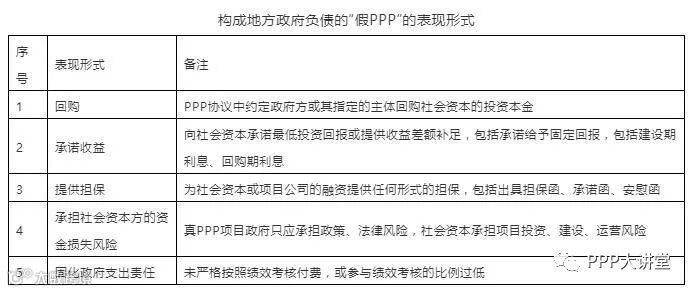 根据10号文、《项目库管理通知》、《关于进一步规范地方政府举债融资行为的通知》、《财政部关于进一步加强政府和社会资本合作示范项目规范管理的通知》,归纳得出PPP构成政府隐性负债的表现形式如下: