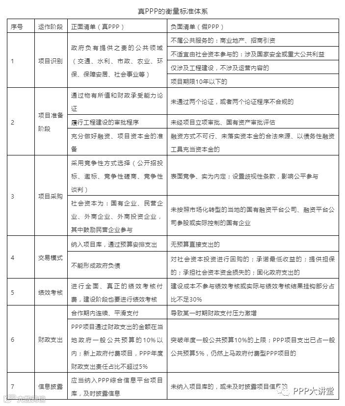 根据前文对PPP发展脉络、对PPP与地方政府负债关系、对国家PPP政策文件的梳理,归纳PPP项目的正负面清单,从PPP的运作流程方面得出真PPP应当具有的如下基本点: