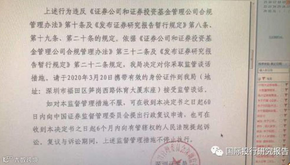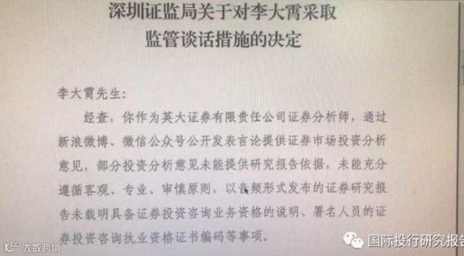 一封盖着监管红戳的《深圳证监局关于对李大霄采取监管谈话措施的决定》文件截图,在财经圈里广泛流传。截图显示,李大霄作为英大证券分析师,通过微博、微信公众号公开发表言论提供证券市场投资分析意见,部分投资分析意见未能提供研究报告依据,未能充分遵循客观、专业、审慎原则。以音频形式发布的证券研究报告未载明具备证券投资咨询业务资格的说明、数名人员的证券投资咨询执业资格证书编码等事项。