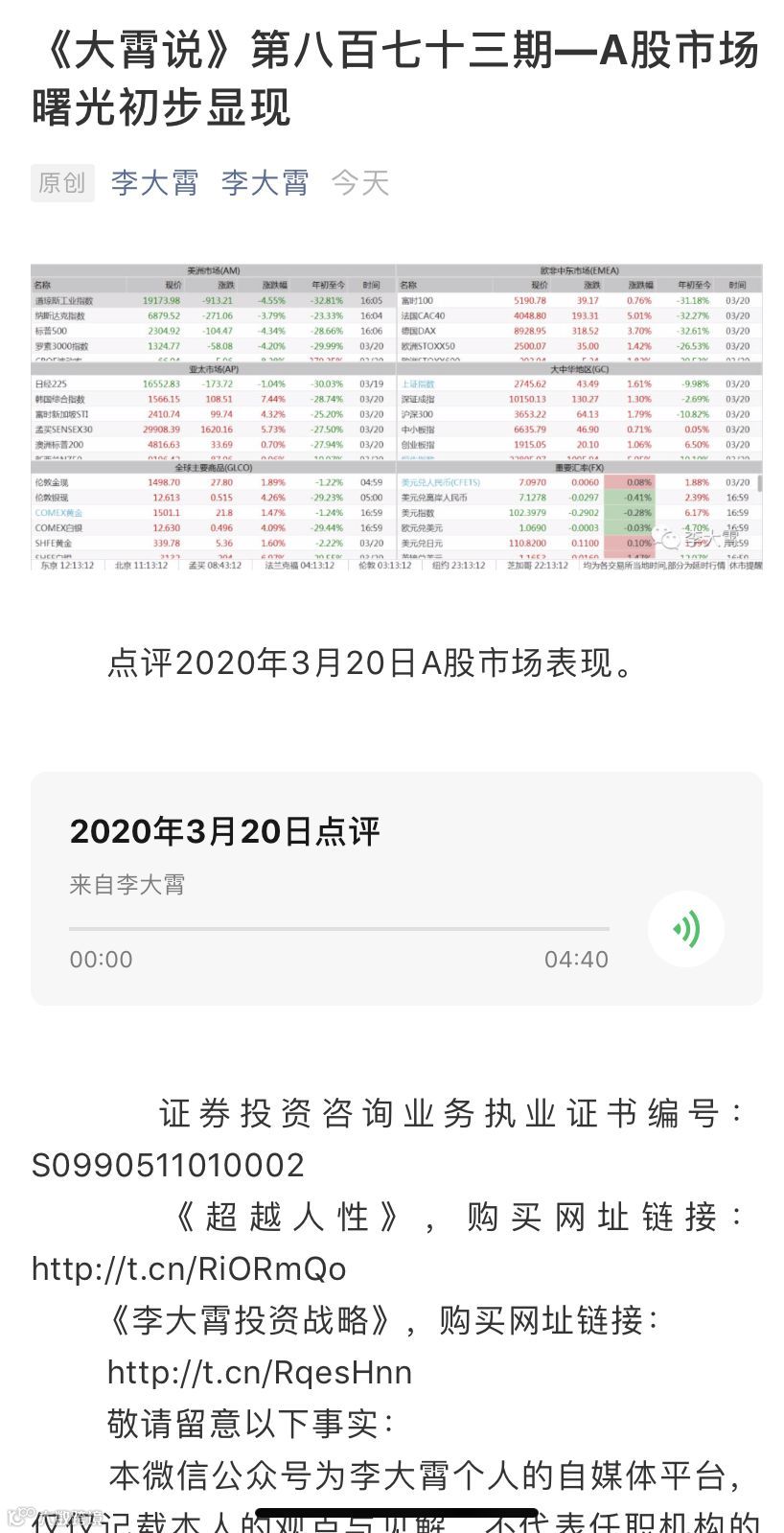 李大霄一直以来坚持在微信公众号“李大霄”上发布音频股评,最近一篇是在21日上午11点55分发布的,主题是点评2020年3月20日A股市场表现,只有一张行情软件截图和一个将近5分钟的音频,没有研报、没有图表。