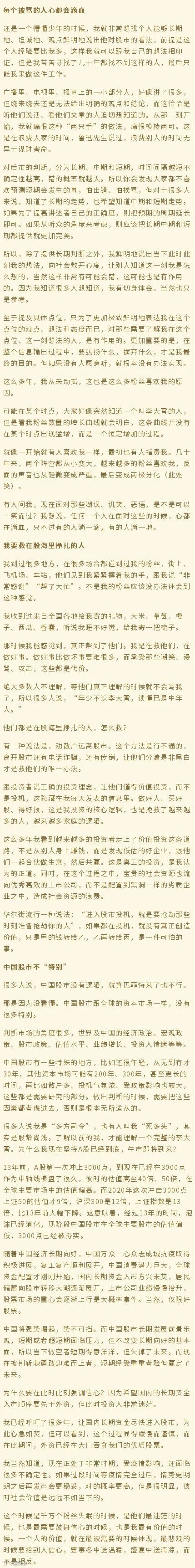 另附李大霄3月发布的口述文章:《李大霄谈李大霄:每个被骂的人心都会滴血,但我依然要唱多》